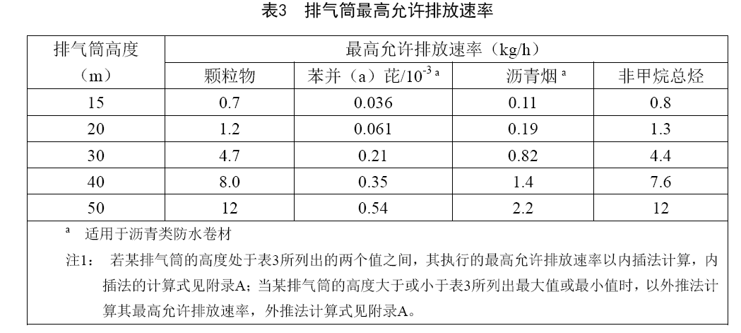 排氣筒中污染物排放除應(yīng)符合表1最高允許排放濃度外,還應(yīng)同時滿足表3規(guī)定的排氣筒高度對應(yīng)的最高允許排放速率要求。